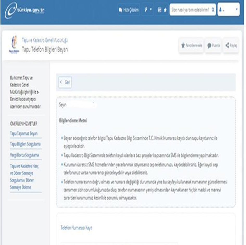 3. ‘Tapu Telefon Bilgileri Beyan’ sayfası açılır. “Bu hizmeti kullanarak beyan edeceğiniz telefon bilgisi TAKBİS’te TC Kimlik Numarası kayıtlı olan tapu kayıtlarınız ile eşleştirilecektir.” ile “Daha önceden kayıtlı bir telefon numaranız bulunmamaktadır.” uyarıları görülür.